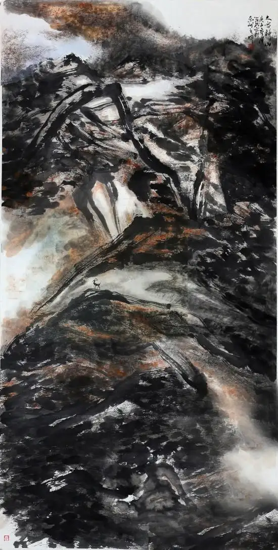 从艺术史演进的角度观之,胡学武的“一笔画”理论并非无源之水。自赵孟頫提出“书画同源”,书法用笔便成为文人画的重要美学准则。在胡学武《大写神山》的作品中,笔墨的浑厚华滋,深得黄宾虹用笔用墨之妙。在作品《梦游天地星焕光》中,那交织流动的线条是对石涛《搜尽奇峰打草稿》笔意的深刻领悟。然而,胡学武并未止步于传统的书画交融,而是选取草书这一最具自由性与抽象性的书体,将其笔法中的提按顿挫、翻绞倒逆推向绘画创作的核心。在传统山水画中,“勾皴擦染点”服务于对自然物象的摹写,而在“一笔画”中,这些技法被解构重组,成为艺术家心性与情感的直接载体。这种转变,恰似禅宗所言“直指人心”,使笔墨摆脱了物象的桎梏,回归到“以形写神”的本质。