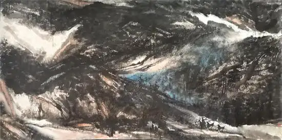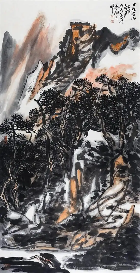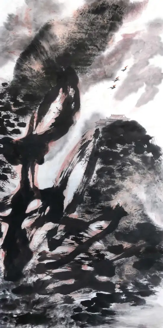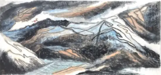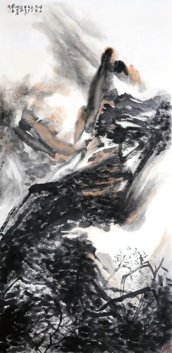 胡学武对草书笔法的创造性运用,展现出对艺术本体规律的深刻洞察。草书线条的连绵性与不可复制性,赋予画面独特的“意象性”与“书写性”。当“拖拉槌砸”的笔触跃然纸上,观者感受到的不仅是山石的形态,更是艺术家创作时的情绪轨迹。这种以笔势贯穿画面的方式,巧妙化解了传统山水画中易出现的琐碎与匠气,使作品在抽象化的同时,依然保持着内在的气韵贯通。如张彦远在《历代名画记》中强调的“骨气形似皆本于立意,而归乎用笔”。胡学武的实践恰是对这一理论的当代演绎。