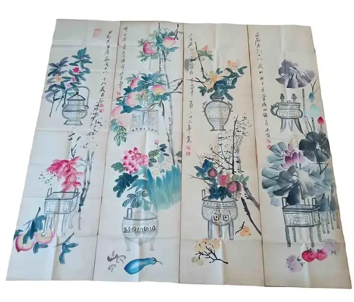 1. 构图布局:采用“上器下果/花”的经典清供构图,每屏独立成景,四屏连挂构成完整的四季清供序列。