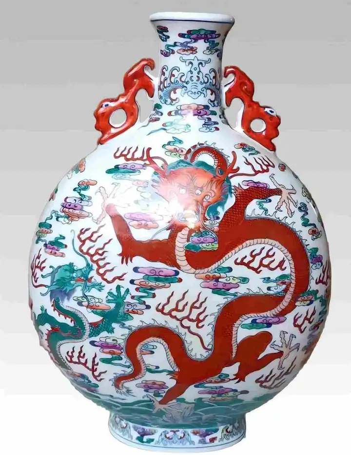 1. 器型:小口直颈,扁圆腹,圈足,两侧饰红釉夔龙耳,器型饱满端庄,线条流畅。