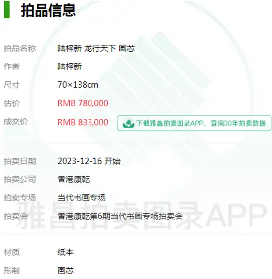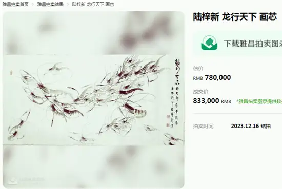 2023年12月16日,香港康乾第6期当代书画专场拍卖会落下帷幕,陆梓新的《龙行天下》画芯以833,000元人民币成交,超出其780,000元的估价,在当代书画领域掀起了对“传统题材现代化表达”的深度探讨。这幅纸本作品,尺寸70×138cm,以虾为元素构建“龙行天下”的意象,在传统水墨与当代艺术语言的碰撞中,展现出独特的艺术价值与市场魅力。