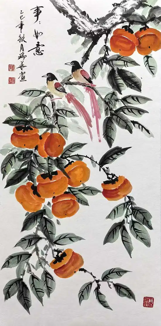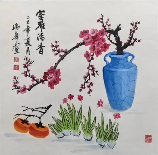 作品选取“清供”题材,以蓝瓶插梅、地面衬以兰草、柿子的组合,营造雅致文人空间。蓝色花瓶以裂纹釉技法表现,古朴又富细节;梅花枝桠苍劲,粉色花朵点缀其间;兰草叶片修长,尽显君子之姿;两个橙红柿子圆润饱满,暗含“事事如意”的祝福。整幅画布局精巧,物象简而意涵丰,笔墨简练却韵味十足,是“雅致生活”主题的典型表达。