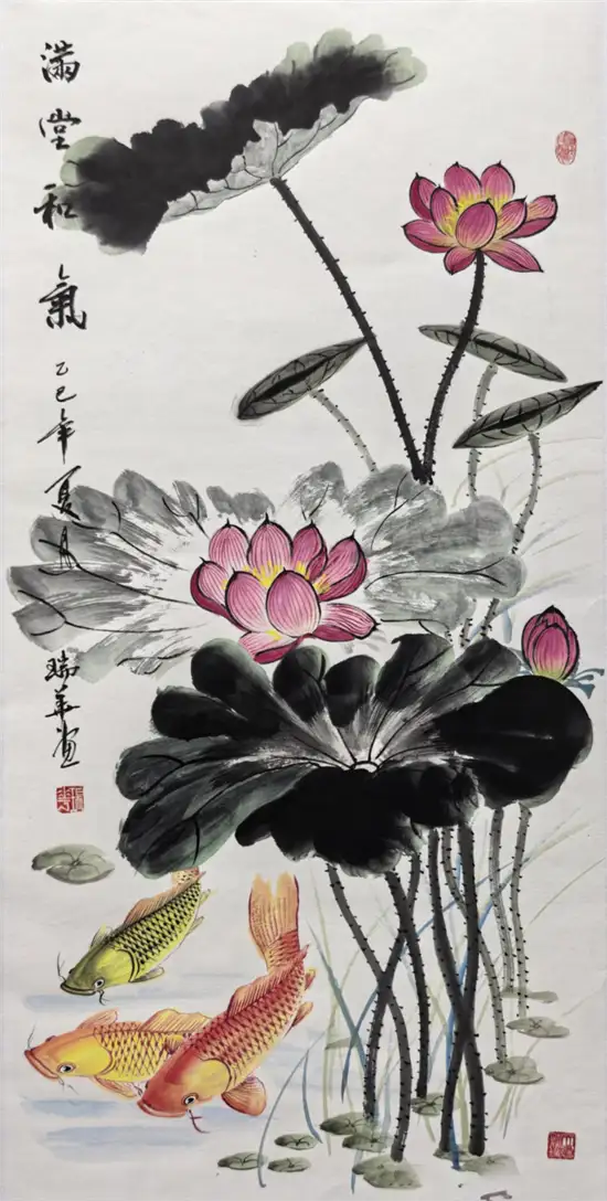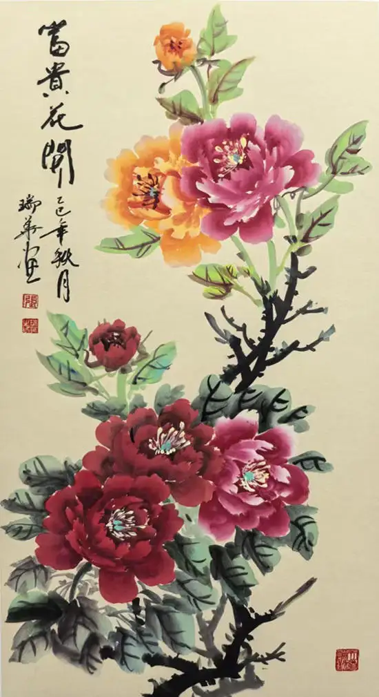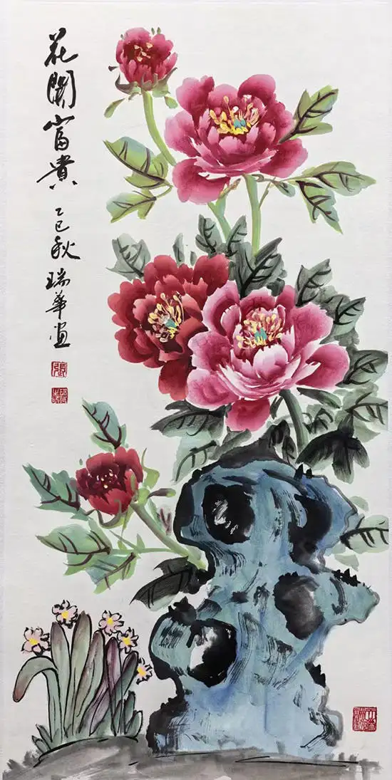 张瑞华的国画涵盖花鸟、山水、人物,整体风格“重意境,朴厚雄浑、大开大合,富有浓厚的生活气息”。这种风格既继承了传统文人画“意境至上”的理念,又扎根于生活细节,最终形成“雅俗共赏”的艺术特质。擅长以牡丹、荷花、梅兰等传统题材,注入生活化的审美情趣与吉祥寓意。