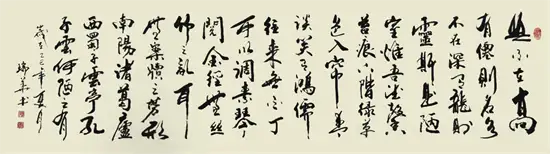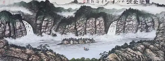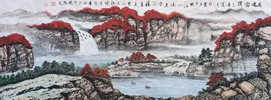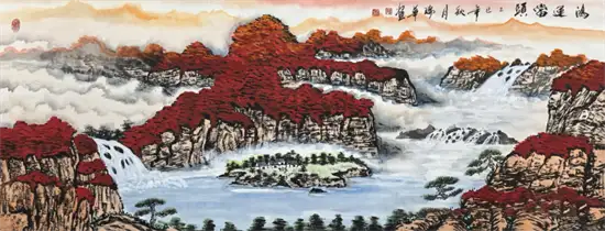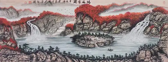 构图上,采用“高远与平远结合”的方式,红色主峰顶天立地,左右山峦呼应成势,下方水域开阔平静,形成“山—云—水”三层空间。笔墨上,山石以斧劈皴与披麻皴结合,既表现岩石质感,又通过墨色浓淡体现体积感;红树点染“写意”与“工笔”结合,让画面层次分明。整幅画气象雄浑却不失灵动,是传统山水技法与当代审美结合的成功尝试。