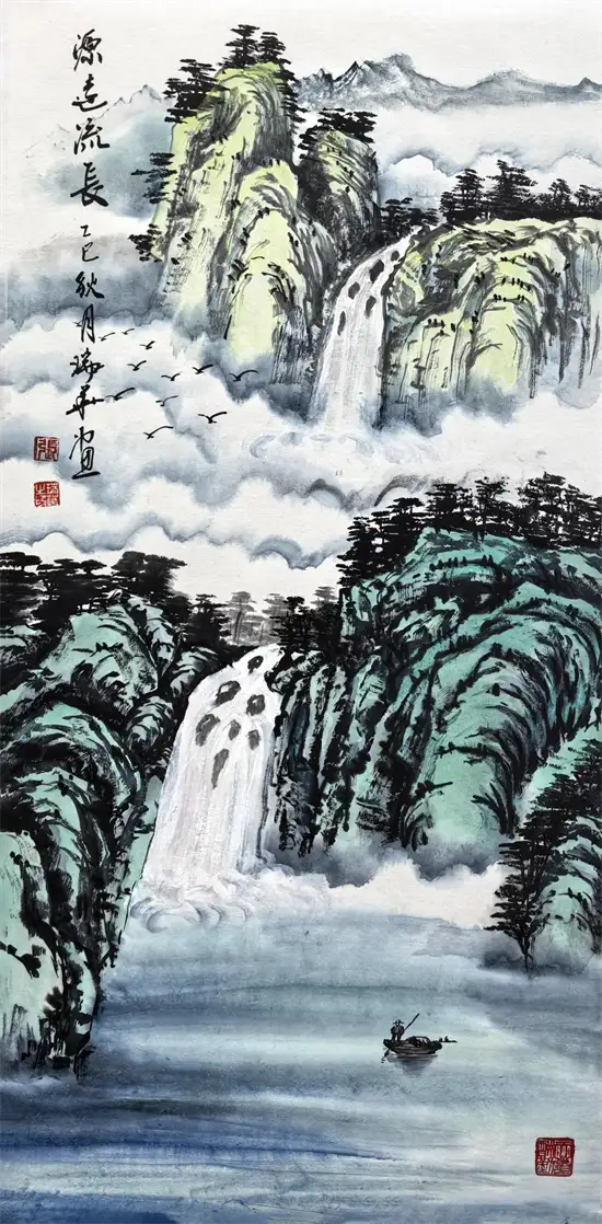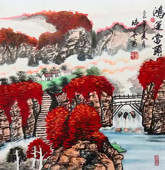 《鸿运当头》充分体现“大开大合、朴厚雄浑”的风格。画面以红色山峦为主视觉,红树如火焰般燃烧,点题“鸿运”;云雾流转,以淡墨渲染朦胧意境;瀑布飞泻,水花四溅的细节与山体厚重形成动静对比;山间屋舍隐于绿树,增添人文温度。