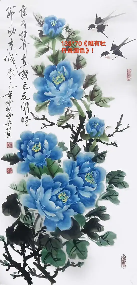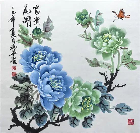 这幅作品以蓝、绿双色牡丹入画,突破“以红为贵”的传统设色惯性。蓝色牡丹笔墨浓淡层次丰富,花瓣晕染自然;绿色牡丹以墨线勾勒轮廓,敷以淡绿,尽显清雅。一只蝴蝶停驻花枝旁,翅膀斑纹刻画细腻,与牡丹的厚重形成“动与静”“艳与雅”的对比。题款“富贵花开”呼应吉祥寓意,通过非常规色彩搭配,展现对传统题材的创新解读——富贵可在清雅中彰显格调,让传统花鸟贴近当代审美。