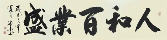 此作更具行草意趣,在颜体根基上融入笔势的纵逸。“盛”字撇捺如雄鹰展翅,“和”字牵丝若流水潺潺,整体气象雄健又不失洒脱,将“人和”与“业盛”的因果关联,通过笔墨的抑扬顿挫予以视觉化诠释。这种“师古不泥古”的实践,体现了他对传统书法创造性转化的智慧。