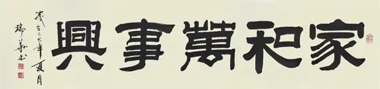 这幅作品笔力沉雄,线条如锥画沙,既具颜体楷书的端庄稳重,又在撇捺、转折处可见方圆笔法的灵动变化。“家”字结构宽绰,尽显包容之态;“和”字笔画凝练,传递和睦之韵。整幅作品布局疏朗,墨色浓淡相宜,将“家和万事兴”的传统吉语以极具张力的书法语言呈现,既适合厅堂悬挂的审美需求,又通过笔墨的厚重感传递出对家庭伦理的敬重,是其颜体书法生活化表达的典型范例。