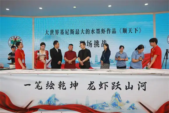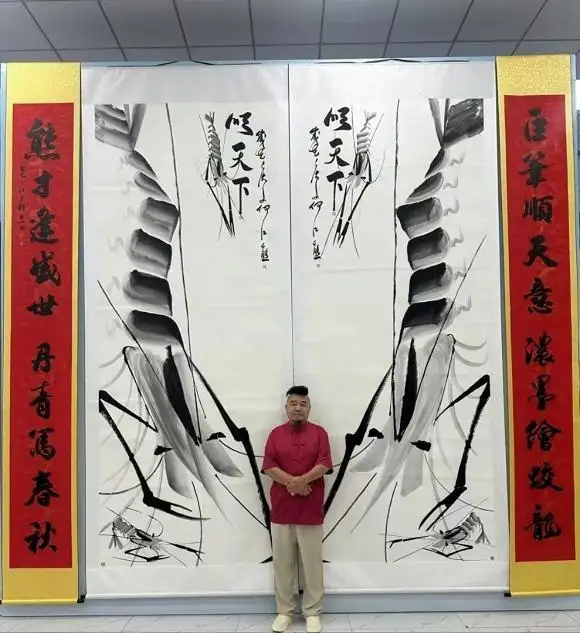 何江熊老师曾挥毫挑战并成功创下“大世界基尼斯纪录”的《虾王·顺天下》。此次挑战不仅在于画作的巨幅尺寸,更在于其运用了独特的“凌空泼墨法”进行创作。这幅作品也因其高超的艺术水准和深刻的哲学内涵(“顺天下”,蕴含 “顺天应人、生生不息”的哲学思考),被国家博物馆收藏。
