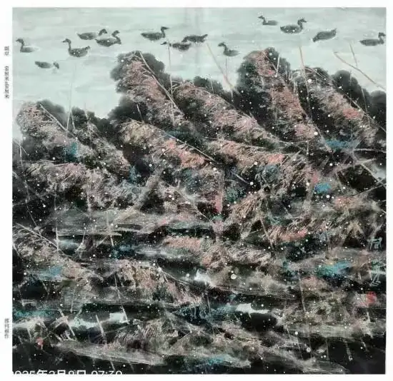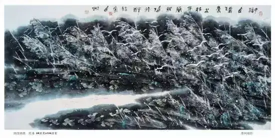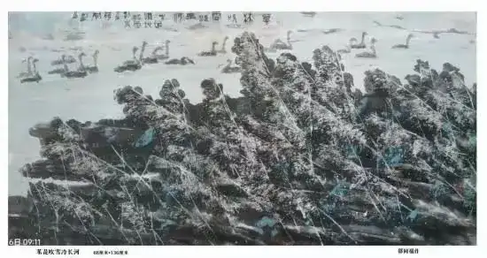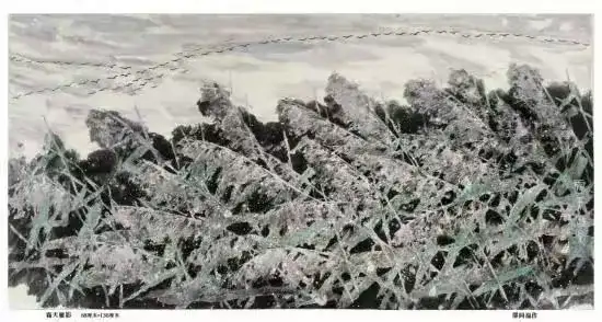 在联合国总部维也纳展藏作品《且看苇林舞素雪》,高寒中的苇林,战风斗雪,弯而不折,彰显东方风骨!在天安门60幅中国画优秀山水.花鸟画网展中的《云海放歌》,一群洁白优雅的天鹅,在玉林之上、蔚蓝之下的辽阔空域,自由舒缓的滑翔,生动地展现中国生态文明建设的重大成就!西方观众惊叹于冰雪写实质感,东方行家则读懂了"雪压青松挺且直"的精神隐喻。