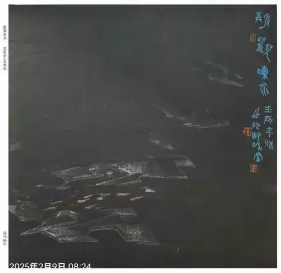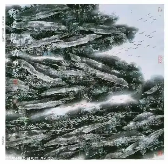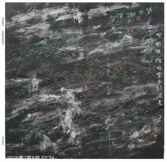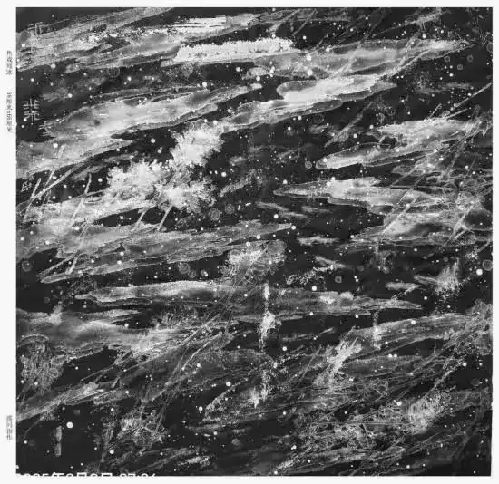这绝非简单的材料叠加:浓度配比、物理调控、落笔时机,每个环节都需千锤百炼!矾水浓度实验:从1%到饱和溶液,测试无数种配比寻找结晶临界点。物理操作增强灵动:对于"板结″不灵动的画面元素,施以"物理干预″处理。多层积墨技法:通过多次矾墨交替叠加,塑造冰雪的厚度与透明感。