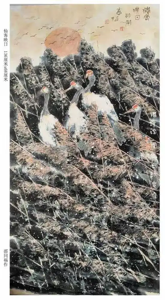 2018年,邵同福的中国湿地冰雪花鸟画横空出世(国作登字一2018一L一00591561)!之后,画家又将视角聚焦于湿地之外的冰雪花鸟世界:菊花凝寒依然独自绽放,在阳光下折射晶莹的光芒;翠竹傲立冰雪,在寒天中坚守着一份宁静与高洁;冬季的芭蕉,虽然已成破碎之态,却仍然奉献一幅冷翠凝霜的画图……这些作品不仅展现冰雪之美,更揭示严寒中生命的坚韧,构建起自然生态的冰雪美学范式。