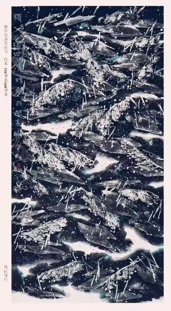 长江的浩渺与汉水的温润滋养了邵同福的笔墨,却未能消融他心中对冰雪的向往。生于水乡却钟情雪韵,这种看似矛盾的情感成为他艺术生命的原动力。童年记忆里,冬日窗棂上的冰花,晨霜覆盖的田野,在他眼中幻化成天然的岁寒画卷。这份刻进骨血里的冰雪情结,驱使着已是成熟花鸟画家的他,在九十年代毅然转身,踏上一条荆棘丛生的创新之路。