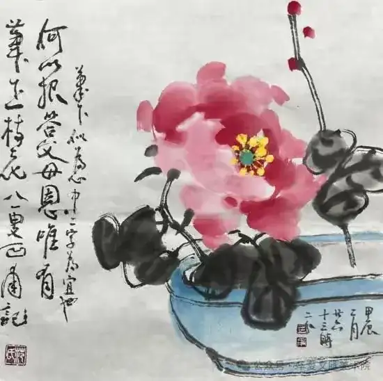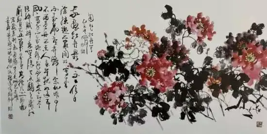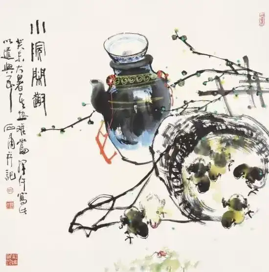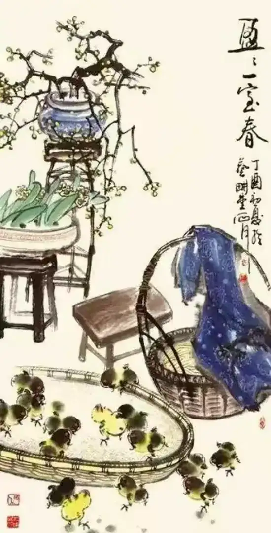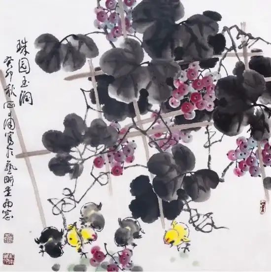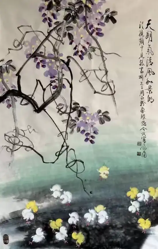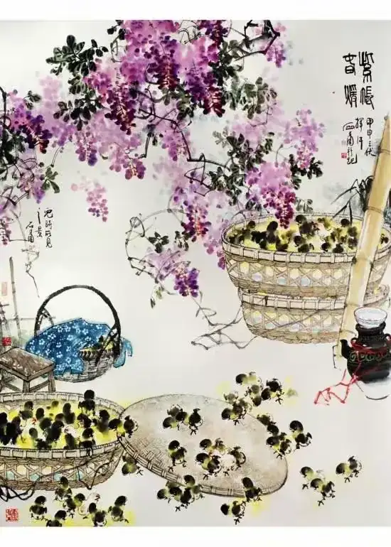 不只雏鸡,他还画葡萄,颗颗晶莹剔透的果实,色彩鲜明突出又丰富;他还画紫藤花,串串苍润而嫩逸的花枝,色彩纯净而清透;他还画牡丹,朵朵艳而不俗,色墨并用,疏密有当,颇有自然之神韵……范石甫的画作里总是充满生活之美、自然之真、艺术之魂,以纯朴的创作风格抚慰着芸芸众生的心灵深处。