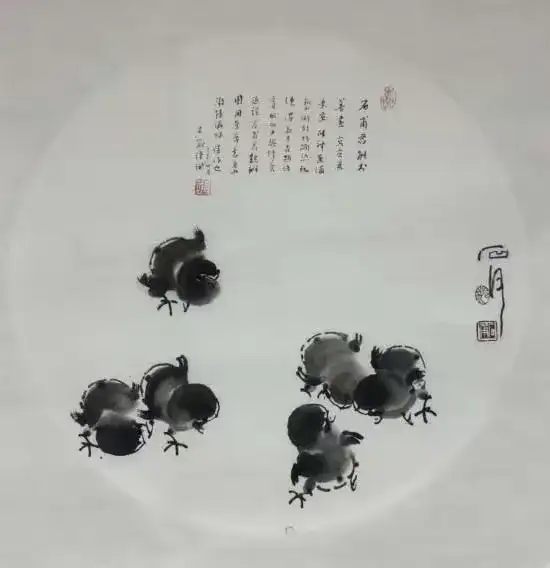 中国是一个诗的国度,充满诗意的美,好的花鸟画,既要画出自然界花鸟的生命,更要写出画家对生命万物的感悟。著名美术理论家马鸿增曾将范石甫写意花鸟画的艺术特质概括为三点:充沛丰富的生命精神,精练生动的笔墨语言,交融互补的诗书画印结构。纵观范石甫的雏鸡系列画作,也处处体现着“天人合一”的理念,赋予其灵魂与生命,也象征着人的理想精神。正如他一幅作品题词所言:“从小默默无闻 长大一鸣惊人”。诗与画交互融合令人沉醉其间,具有极强的艺术感染力,这大概也是范石甫内心的真实写照。