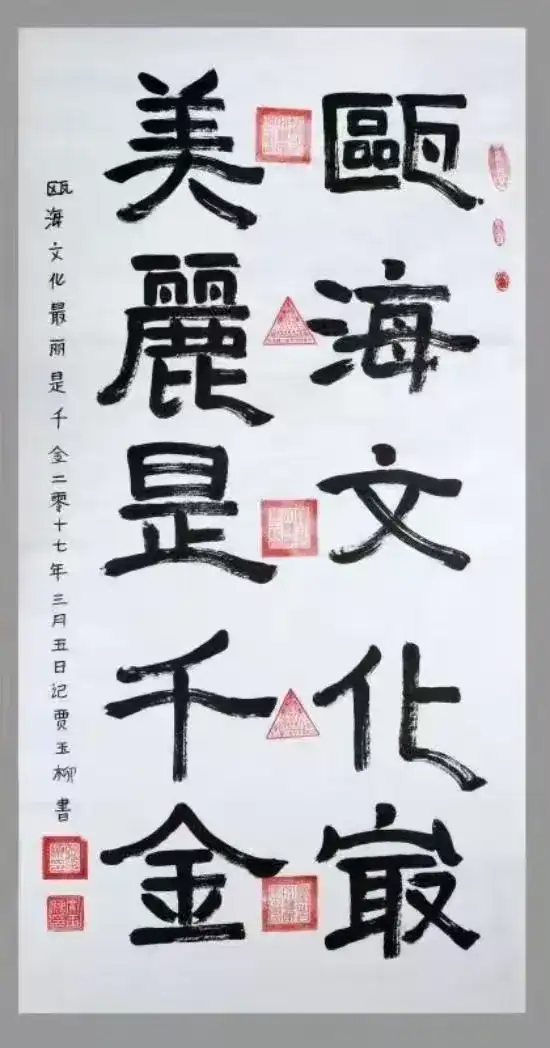2014年中国共产党中央委员会党校,荣获2013年度全国“十佳优秀退休干部”称号荣誉证书。世界华人艺术家联合会荣获2014年“中国当代十大名家”称号荣誉证书。中国政协画院,担任政协画院(副院长之职)荣誉聘书2014年。中国国家书画院,国家艺术奖金奖荣誉称号“国家艺术大师荣誉称号”2014年。中国国际经济技术合作促进会品牌促进中心《全国书画行业A级AAAAA服务单位,温州市贾玉柳书画店》2014年。中华人民共和国国家版权局《著作权登记证书》经中国版权保护中心审核“书法作品沁园春雪”书法版权保护证书;2014-6-01029号。中华人民共和国国家版权局,著作权登记证书,经中国版权保护中心审核,美术作品《钓鱼岛》国画版权,登记证号:2014-6-01029。世界华人艺术品评估鉴定委员会,ISC2014艺术品评审润格为:国画(作品)500至550亿英镑1平方尺,ISC2014艺术品评审润格为:书法(作品)450至500亿英镑1平方尺,证书档案编号:NO2014-130858,中国就业培训技术指导中心《高级信用管理师、国家职业资格一级》证书编号:PXXYGL14060023。中华人民共和国文化部艺术委员会,世界华人收藏家协会,世界艺术研究会,有专家严格审核“最贵国宝艺术家”荣誉称号,国宝艺术珍品证书2014年,国宝艺术珍品金杯。
