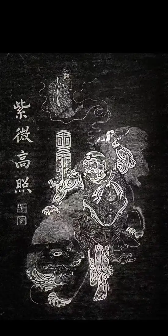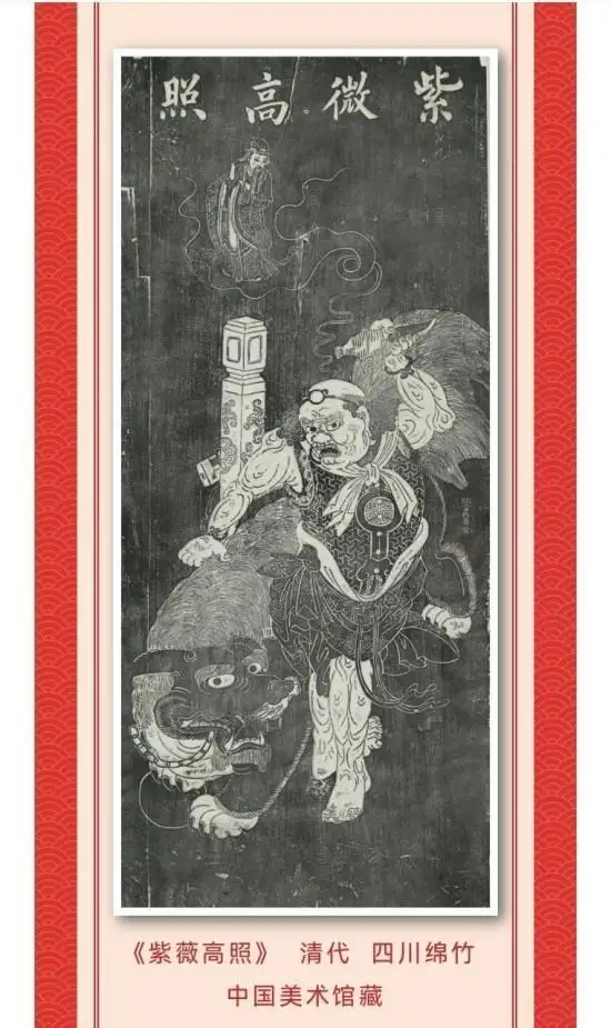 画面讲的是道教中紫微星的传说。紫微星是“中天紫微北极太皇大帝”,协助玉皇执掌天经地纬日月星辰和四时气候,象征着驱邪避凶、迎福祈祥,受到历代皇帝的祀礼。而画中的紫微星正化身力士降服猛兽,寓意镇压邪恶。