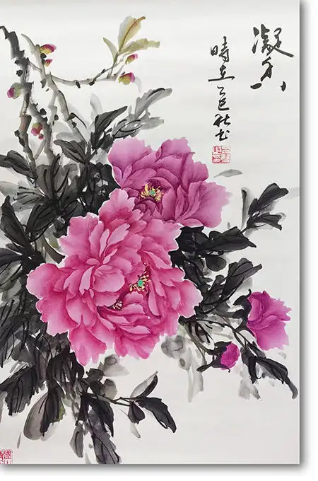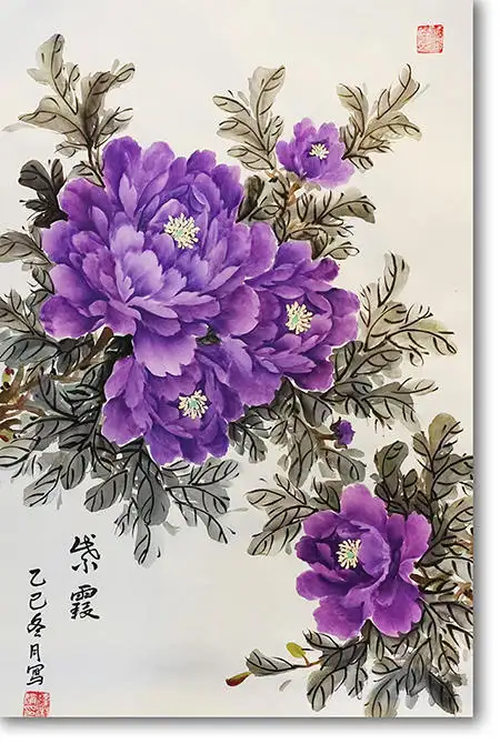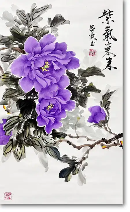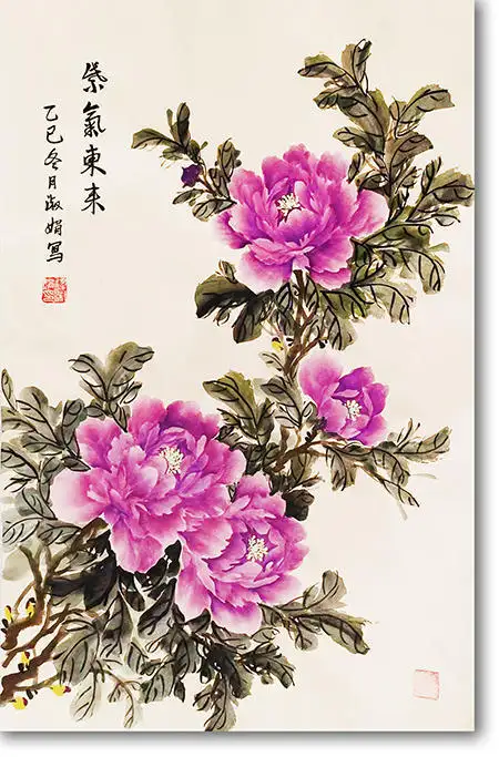 吕双笔下的牡丹,既有会派牡丹灵动洒脱、墨色淋漓的共性,又融入了她作为文化传播者的独特视角。她的作品,无论是《凝香》中那朵娇艳欲滴的粉牡丹,还是《紫气东来》里高贵神秘的紫牡丹,都在展现牡丹自然美的同时,传递出一种积极向上的精神力量。