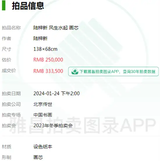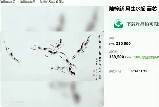 2024年1月24日,北京传世2023年冬季拍卖会的中国书画专场中,陆梓新的《风生水起》画芯以333,500元人民币成交,超出其250,000元的估价,为当代水墨虾题材作品的市场表现与艺术价值写下了生动注脚。这幅设色纸本作品,尺寸138×68cm,以虾为核心意象,在传统笔墨与当代审美之间找到了精妙的平衡。