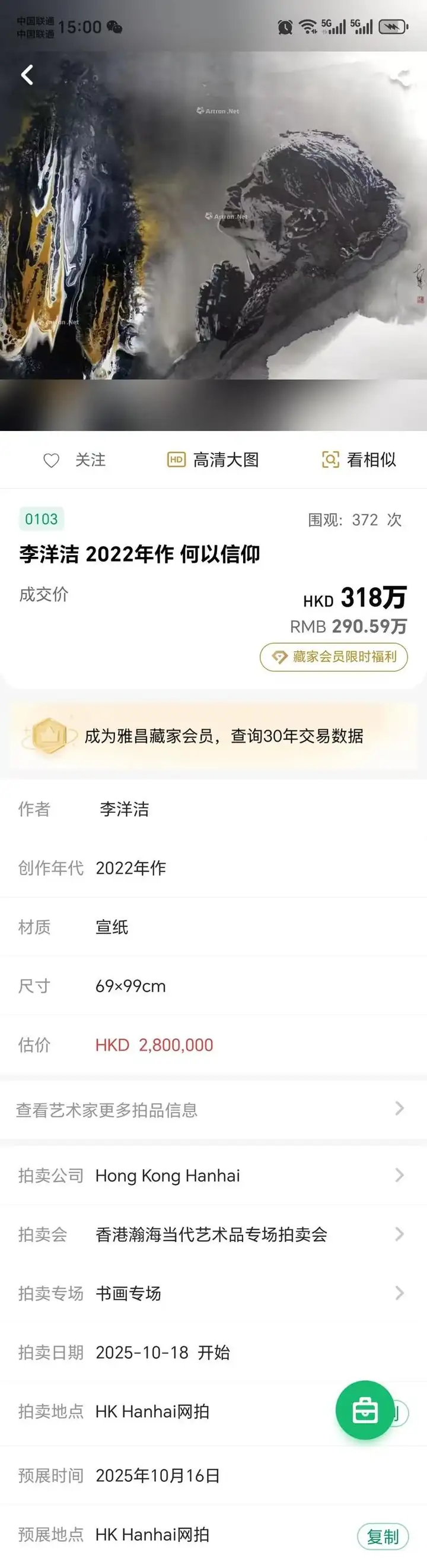 在2025年10月18日由Hong Kong Hanhai主办的香港瀚海当代艺术品专场拍卖会庆典现场,此前备受关注的李洋洁作品《何以信仰》经多轮激烈竞逐,均已落槌成交,从各项标准来看,能上雅昌拍卖艺术榜的艺术家,均是得到过市场检验过的艺术家,要具备较高的资历,艺术作品和艺术地位得到业界的广泛认可,在艺术市场起到带动引领的作用。