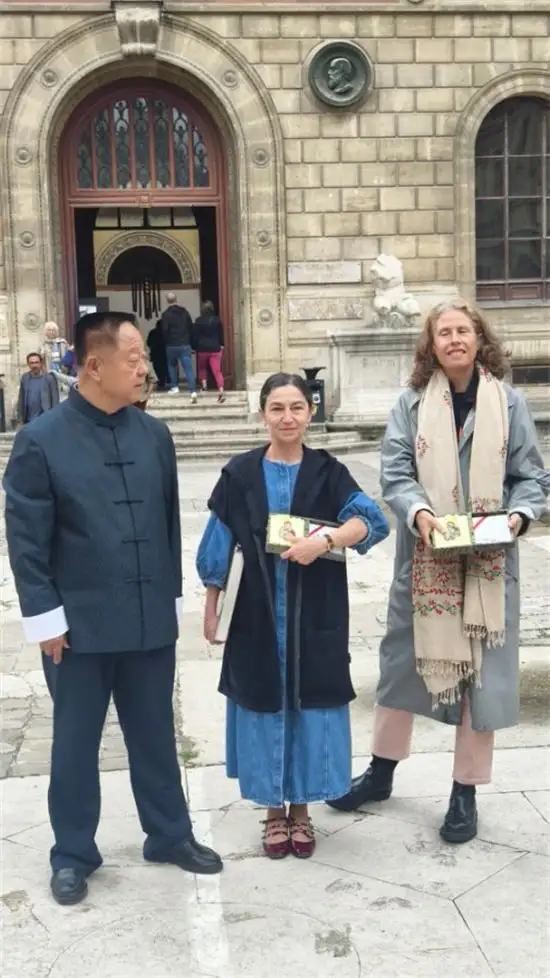 下午13:00巴黎国立高等美术学院绘画系主管、教授:阿梅尔·普拉达利尔女士(Ms. Armelle Pradalier)和绘画系教授:埃米尔·杰罗姆先生(Mr.Émile Gérôme ),在学院学习宫前方的广场上与中国艺术家代表团举行了艺术作品收藏仪式并合影留念,现场学院师生也纷纷驻足观看,共同见证这一难忘的时刻。