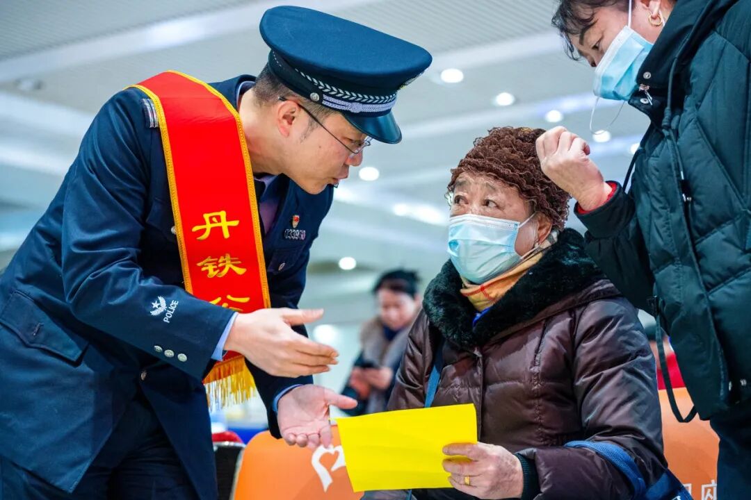图为丹东公安处民警在候车室与旅客开展亲情互动