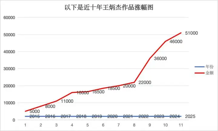 而国内艺术品金融专家曾经预测王炳杰将会成为最具影响力的艺术家,甚至会超越古人。以下是王炳杰这些年作品在市场上的价格趋势图。