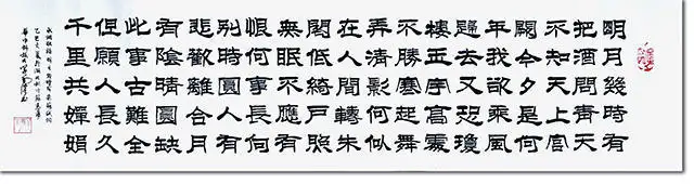 1940年生于江西玉山的毛传信,是华中科技大学副教授,更是一位浸淫翰墨八十余载的书法大家。其以苏轼《水调歌头·明月几时有》为内容创作的篆隶楷行草五体书法组作,既是其数十年书法修为的集中展现,亦是传统书画艺术与古典文学交融的典范,笔墨间尽藏家学底蕴、师法积淀与艺术才情。