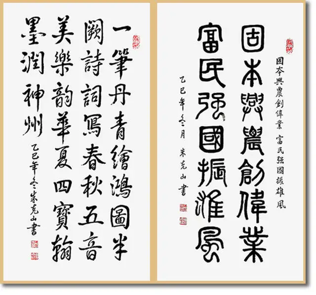 而在篆书作品《固本兴农创伟业 富民强国振雄风》中,又能感受到其线条的凝练与古朴,体现了他对传统书法的深刻理解与传承。 艺术源于生活,朱克山先生丰富的人生经历,为其书法注入了深厚的情感内涵。他早年从事教育工作,后又在不同行业任职,这些经历使他对生活有着深刻的感悟。