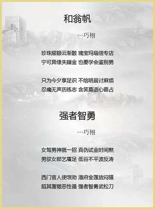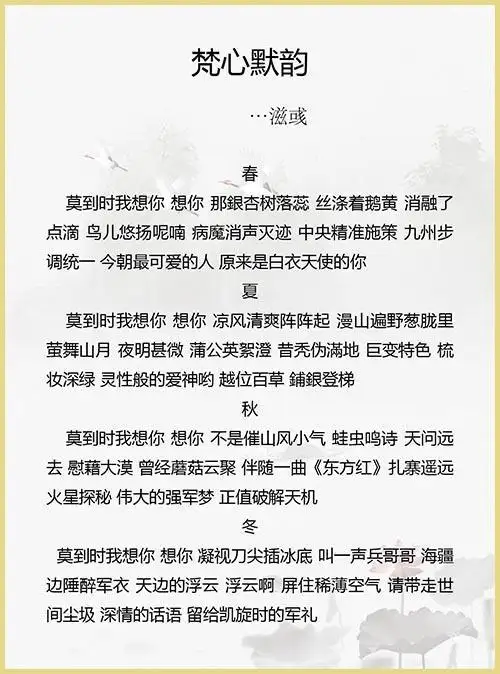她的情诗绝非柔媚缠绵的滥觞,而是带着实践的灵性突破。“宁可异缘失镶金,也要学会鉴别男”,以直白的口吻拆解情感幻想,“忍痛无声历练志,含笑莫语心霸占”更是写出女性在情感里的独立姿态——不是依附,而是筛选与自守,这正是她“情诗女后”的独特底色:以清醒替缠绵,用智商裹柔情。