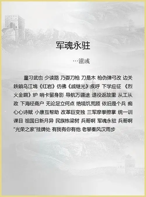 他的诗,首先烙着抹不去的军魂容颜。《军魂永驻》是他人生轨迹的凝练:“童习武也 少读路 乃耍刀枪”的少年意气,“边关铁锁乌江坞”的军旅记忆,再到“退役返故里 从工从政 下海经商户”的身份换位,一句“无论立足何点,绝境饥荒,依旧是个兵”,道尽了军人初心的执拗 ,“三军摩拳擦掌 统一训练课目”的团队感、“军魂永驻”的信念,蕴含在字里行间。这种“兵味”让他的诗跳出了柔媚的窠臼,带着神圣的军人宗旨,发自内心的讴歌与传承,是个人经历与时代记忆的叠印。
