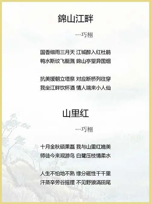 地域基因则是她诗的另一重锚点。如《锦山江畔》,鸭绿江“斯纹飞艇”、锦山亭外的“异国烟”,与抗美援朝塔、断桥的历史印记交织,个人闲饮的悠然里,蕴含着丹东这片土地的厚重;《山里红》中“十月金秋硕果磊,我与山里红媲美”,以本土风物作比,把师徒观鸟、田间辛劳的日常,写得鲜活又接地气,让诗词成了地域生活的“文字镜像”。