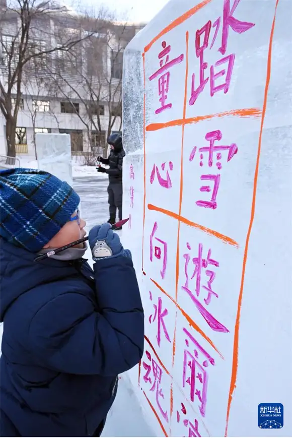 展现孩子们对文化传承的独特理解,幅幅精彩,冰的晶莹、墨的浓艳与色彩的明快相映成趣,既具传统书法神韵,又显冰雪艺术灵动。铁笔游走,墨韵凝冰,以独特艺术语言,在零下二十度的严寒中书写文化传承的热度。
