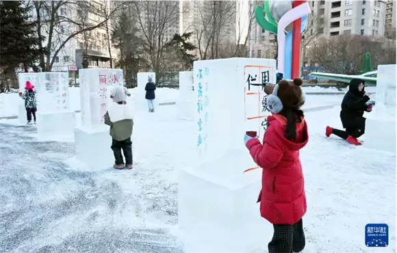 冰碑书法创作是全国首创的冰雪文化体验项目,是一种创新的冰艺书法也称为冰碑书法创作是全国首创的冰雪文化体验项目,是一种创新的冰雪书法艺术形式,此次活动吸引了全市近30所中小学校的30余名同学参与,孩子们用稚嫩却坚定的手,以冰为纸、以墨为笔,冰面上书写出对传统文化的理解与传承,解锁书法与冰雪碰撞的奇妙乐趣。既让学生在体验冰雪乐趣、创作冰面书法的同时,又近距离了解这“冰上雕刻非遗技艺,”实现文化传承与实践体验的双重收获。