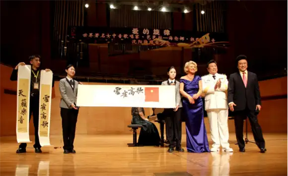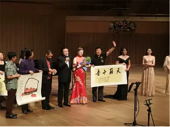 美国著名花腔女高音歌唱家朱丽叶Juliet Petrus《第34届中国哈尔滨之夏音乐会》演出现场,特别邀请北京的画家、书法家谭英卓为特邀嘉宾到登台献字画。