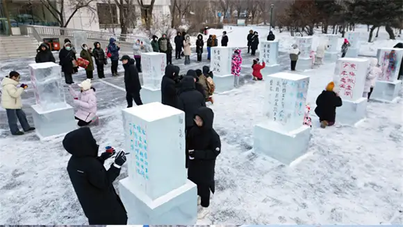展览汇集了来自全市25所中小学校30多位8-15岁冰城少年儿童的冰艺书法作品,现场20余幅主题冰书作品,书体涵盖楷书、隶书、行书,内容既有传统诗词,也有现代创作,从纸上到冰上,改变的不仅仅是书写载体,更是创作思维和艺术表达。
