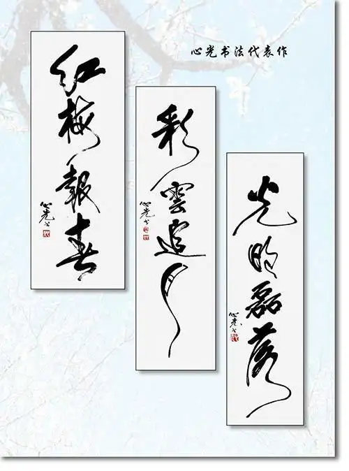 在书法艺术领域,心光先生的书法艺术个性很鲜明,形成了很独特的艺术风格。其代表作《红梅报春》《彩云追月》《光明磊落》,皆是大笔一挥运用毛笔的提按使转虚实变化,赋予线条独特的生命力。毛笔书法,更考验创作者对力度的精准把控与对笔墨的深刻理解,心光先生凭借数十年的功力,将运笔的敏感度转化为艺术语言:《红梅报春》其书法线条颇有气势且很灵动,富有生命力,笔势连绵,线条如虬曲梅枝,兼具刚劲与柔韧;《彩云追月》以流畅婉转的墨线勾勒出云月相随的诗意画面,虚实相生间尽显浪漫情怀;《光明磊落》则以斩钉截铁的笔触、开阔舒展的布局,将四字箴言的内涵与书法形式完美统一。他的书法不仅突破了传统书法的工具局限,他的书法更将文人风骨与现代审美相融合,展现出“书为心画”的深刻内涵。