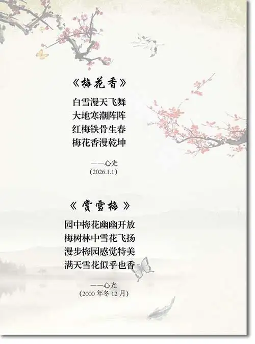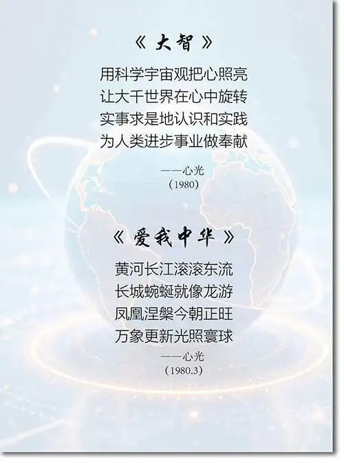 心光先生的诗作兼具家国情怀与哲思意趣。作于1980年的《大智》,以“用科学宇宙观把心照亮”开篇,将科研工作者的理性认知融入诗歌语言,“实事求是地认识和实践,为人类进步事业做奉献”的表述,既是他学术生涯的信念写照,更彰显出知识分子以天下为己任的担当。同期创作的《爱我中华》,则以黄河长江、长城巨龙的意象抒发家国热忱,“凤凰涅槃今朝正旺,万象更新光照寰球”的咏叹,饱含对民族复兴的热切期盼,字句间流淌着与时代共振的赤子之心。步入新世纪,《赏雪梅》以“园中梅花幽幽开放,梅树林中雪花飞扬”的细腻笔触,勾勒出冬日梅园的清逸之境,“漫天雪花似乎也香”的通感表达,将自然景致与文人意趣相融,尽显其晚年创作的温润与灵动。从宏大叙事到微观体察,心光先生的诗歌始终扎根时代、关照生命,以质朴而真挚的文字,记录着一位学者艺术家的精神轨迹。