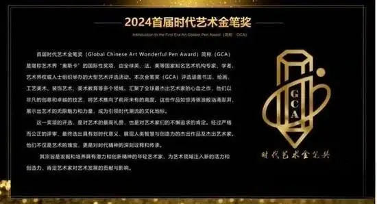 首届时代金笔奖(Global Chinese Art Wonderful Pen Award,简称GCA),被誉为艺术界的“奥斯卡”,是由英国、法国、美国等多国知名艺术机构专家、学者及艺术界权威人士联合发起的国际性大型艺术评选活动。奖项评选覆盖书法、绘画、工艺美术、装饰艺术、美术教育等多个艺术门类,汇聚全球顶尖艺术家的精品力作,创作者以先锋创意与精湛技艺,不断拓展艺术表达边界,以极具冲击力与感染力的作品,展现艺术的多元魅力与磅礴力量,打造引领时代审美潮流的文化标杆。