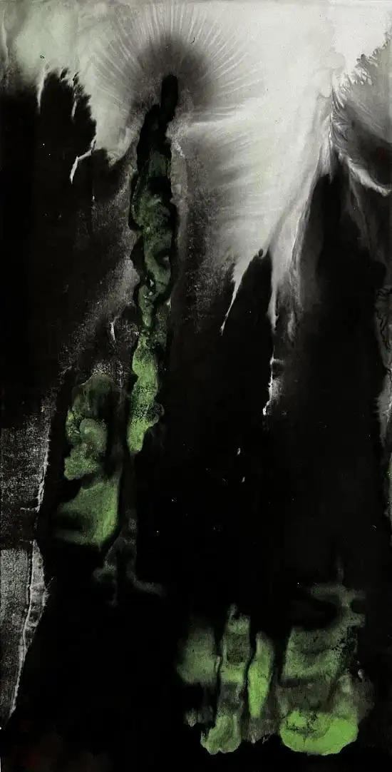 向上望去,浩荡的光晕裹挟着幽微的荧光绿翻涌升腾,构成空灵浩瀚的“天界”。这流动的光晕既像佛国净土中弥漫的光明,又似宇宙间涌动的星云,将“天人合一”的哲学意境与佛教“超越生死”的精神追求融为一体。作品被泰国朱拉隆功大学艺术学院永久收藏,标志着其作为学术研究对象的重要性,为东南亚学界理解中国当代水墨精神提供了独特的视觉文本。