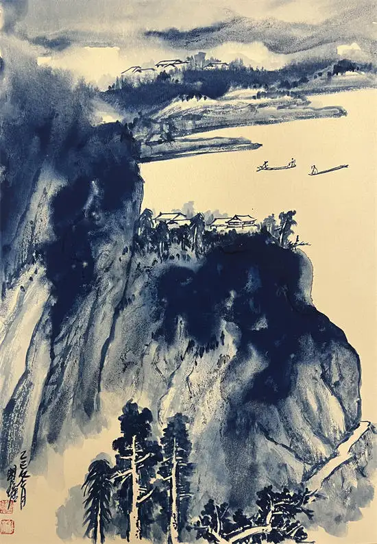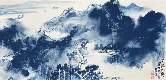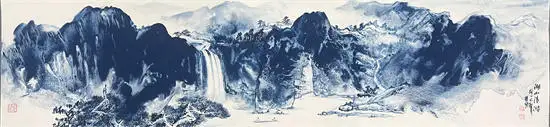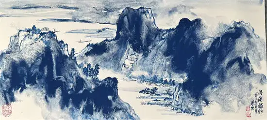 其拓展了传统绘画中用水用色对气韵生成的维度,融合传统水墨与现代技法。在中国现代山水画的创新表现中,水韵青花与黄宾虹的积墨、张大千的泼墨泼彩、李可染的逆光黑山白水及万山红遍的大面积朱砂运用等技法具有同等重要的艺术突破。