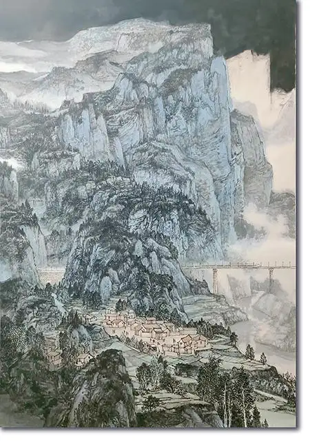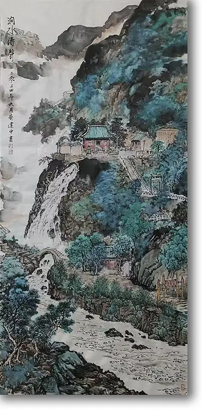 而在《涧水涛声》里,他大胆运用泼墨泼彩的技法,将山体的质感与水流的动感表现得淋漓尽致。崖壁上的建筑与蜿蜒的山道,在虚实之间若隐若现,仿佛将观者带入了一个可游、可居的画中世界。他的线条不再是孤立的技法,而是与山石的结构、树木的姿态融为一体,共同诉说着自然的韵律。