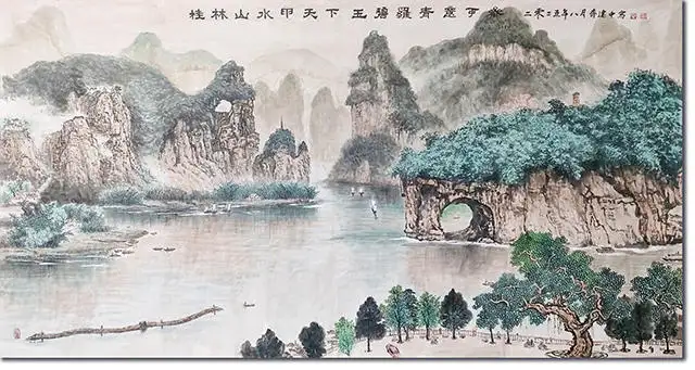 《桂林山水甲天下》则展现了齐建中先生驾驭不同题材的深厚功力。他笔下的漓江,既有"江作青罗带"的柔美,又不失"山如碧玉簪"的奇崛。画面右侧的象鼻山以写实的手法刻画,而远处的群峰则以泼墨写意,这种技法上的对比与统一,正是他"笔墨与形象相互协调"创作观的最好体现。