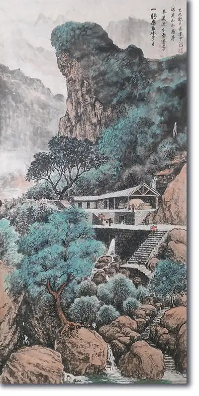 在《记关山水磨房》中,他以浓墨重彩的青绿点染山林,却用留白与淡墨勾勒出远山的轮廓,虚实相生,层次分明。山脚下的水磨房与石阶行人,为静谧的山水注入了人间烟火气,使画面在壮阔中不失温情。这幅作品生动诠释了他"为主题服务"的创作理念——色彩的浓淡、笔墨的干湿,都为了烘托"半溪流水奏清音"的诗意。