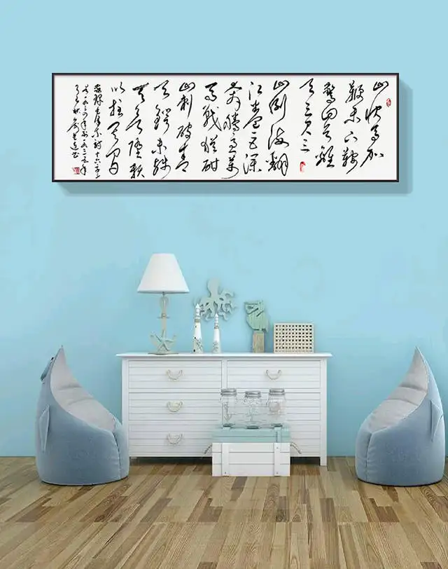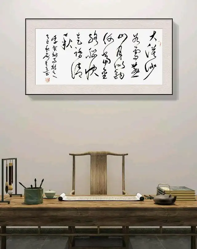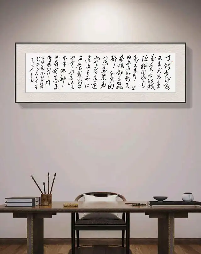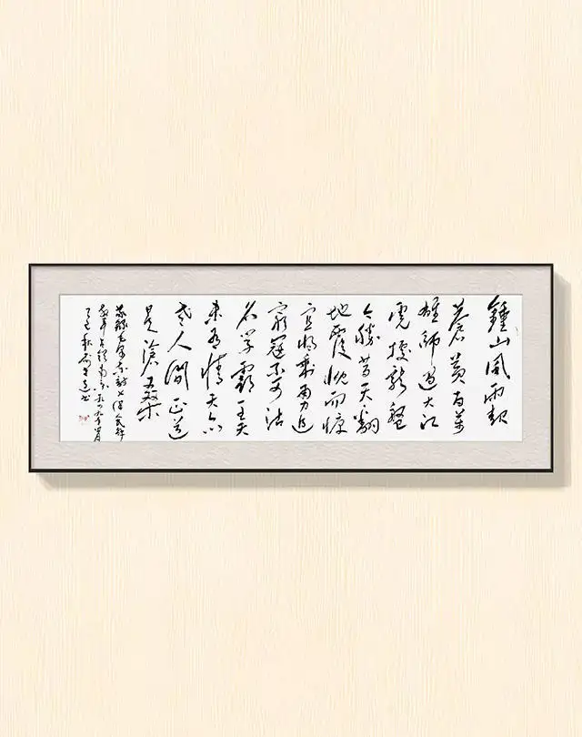 以草书书写毛泽东诗词,是俞建连创作的核心选择,亦是其精神追怀的具象表达。他选取的《七律·人民解放军占领南京》《水调歌头·游泳》等篇目,多饱含革命征程的豪情与民族复兴的壮志,与草书奔放洒脱的艺术特质天然契合。书写“钟山风雨起苍黄,百万雄师过大江”时,其笔势如奔涌的江河,线条粗细交错、墨色浓淡相生,将诗中解放南京的磅礴气势化作视觉上的冲击;挥毫“更立西江石壁,截断巫山云雨”,又以婉转畅达的行笔,勾勒出建设祖国的壮阔蓝图,让笔墨的律动与诗词的意境浑然一体。在他的笔下,草书不再是单纯的笔墨技巧展示,而是成为与伟人对话、与历史共情的桥梁——每一笔飞白,都是对革命岁月峥嵘的追思;每一划重捺,都是对伟人精神的敬仰。