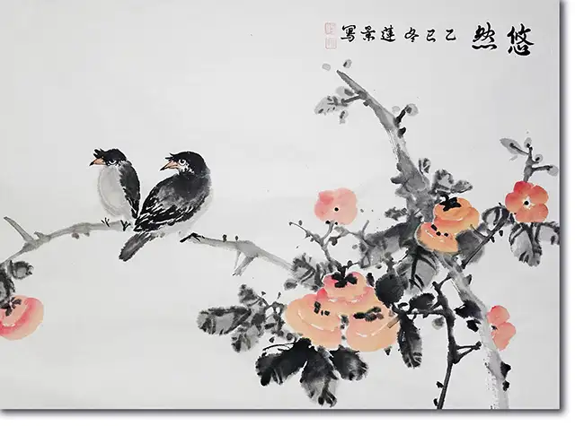 她的《悠悠》图,则将生活美学的触角延伸到了更细微的日常。画中,两只小鸟栖息于枝头,旁边是寓意"事事如意"的柿子。这种将自然意象与美好寓意相结合的创作手法,使作品充满了生活的烟火气。这样一幅小品,无论是置于书房的案头,还是卧室的一角,都能在不经意间勾起观者对生活的热爱与对美好的向往,让平凡的日子也能品味出不凡的韵味。