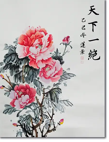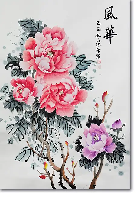 左侧题字与牡丹相映,笔墨流转间,是她对牡丹精神的体悟。从自幼的兴趣萌动,到拜师后的系统研习,李飞凤的牡丹创作之路,是热爱与坚持的交织。短短两年间,她接连斩获墨缘堂特等奖、育达杯一等奖、韶华杯特等奖等全国性大奖,这份成绩的背后,是日夜临池的打磨,是对牡丹形神的反复揣摩。她以花为媒,将心底的热爱化作笔尖的线条,让紫牡丹在宣纸上拥有了鲜活的生命力,既传承了会派牡丹的艺术精髓,又以个人的审美视角,赋予传统牡丹画新的时代意趣。