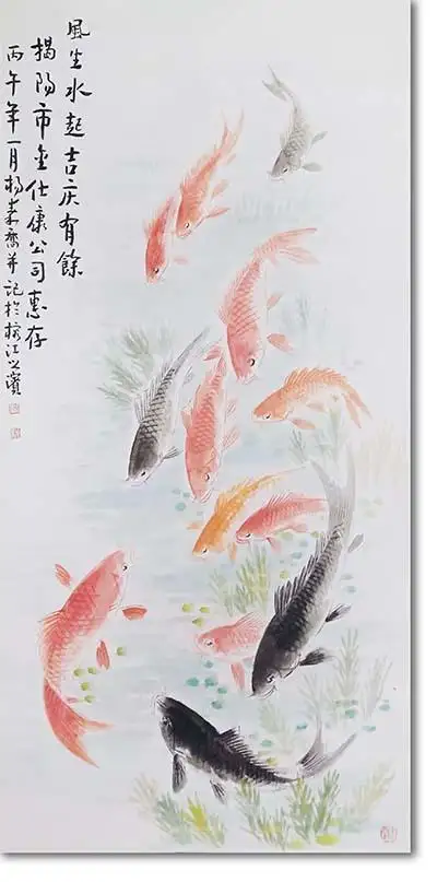 杨秦乔这幅《九如圖》,以七尾锦鲤游弋之态,既承续了中国传统花鸟画的精神内核,又赋予了当代审美与文化价值,是其“岭南鱼王”创作风格的凝练体现。