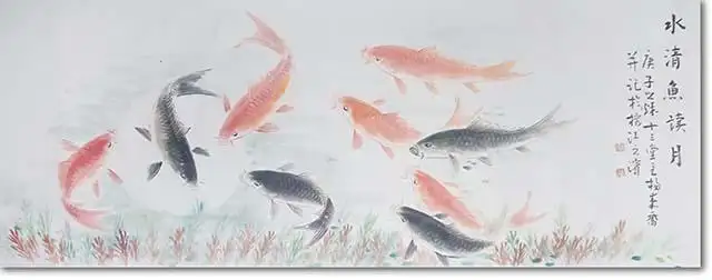 从文化寓意看,《九如圖》的价值更在于意象的当代转译。“九如”典出《诗经》,本为祝颂之词,作者以七尾锦鲤(“七”暗含“吉”意)重构这一传统意象,既保留了“鱼”象征富贵、吉祥的民俗内涵,又以鲜活的画面消解了旧式吉祥画的俗套感——游鱼无拘无束的姿态,暗合当代人对自在生活的向往,让传统祝福拥有了更松弛的精神共鸣。这种“旧题新画”的方式,让民俗意象脱离了符号化的桎梏,成为连接传统与当代审美的纽带。