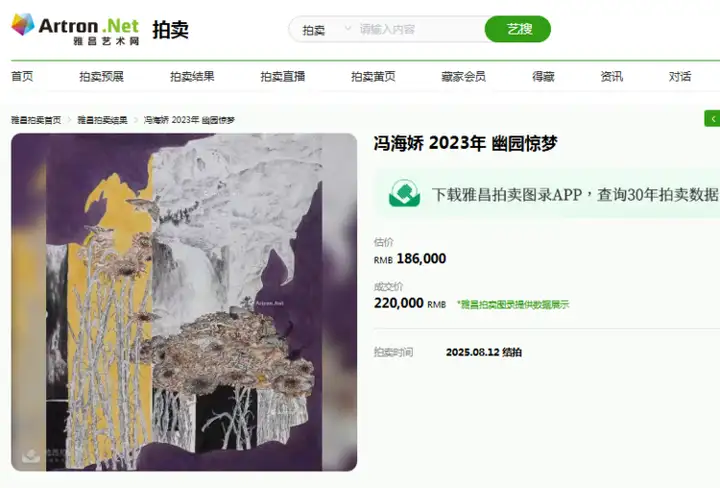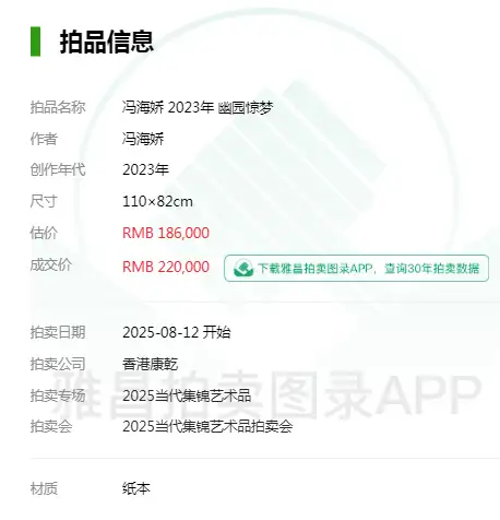 在2025年8月12日由香港康乾拍卖有限公司主办的2025当代集锦艺术品拍卖会庆典现场,此前备受关注的冯海娇作品《幽园惊梦》经多轮激烈竞逐,已落槌成交,从各项标准来看,能上雅昌拍卖艺术榜的艺术家,均是得到过市场检验过的艺术家,要具备较高的资历,艺术作品和艺术地位得到业界的广泛认可,在艺术市场起到带动引领的作用。其艺术前景与市场价值是不可估量的。作品成交可在雅昌艺术品拍卖网查询!